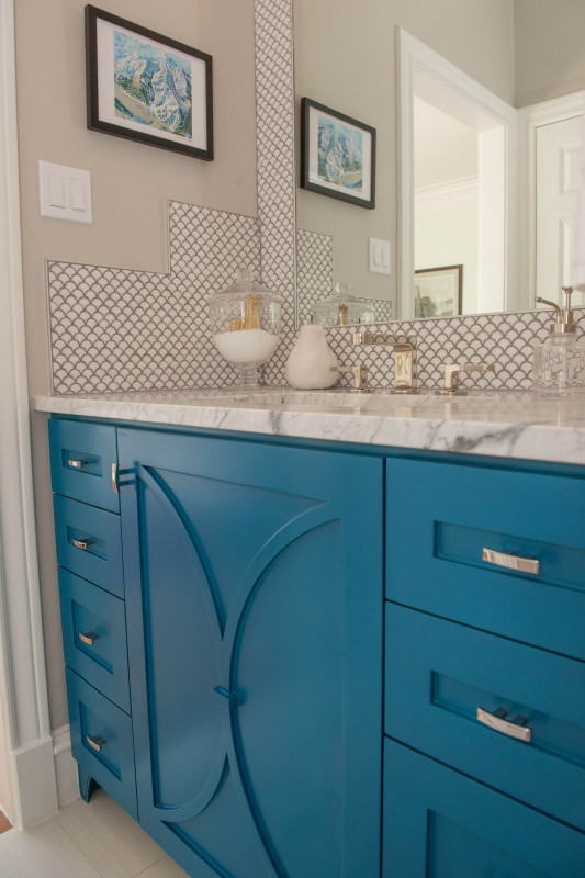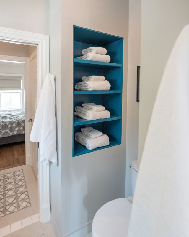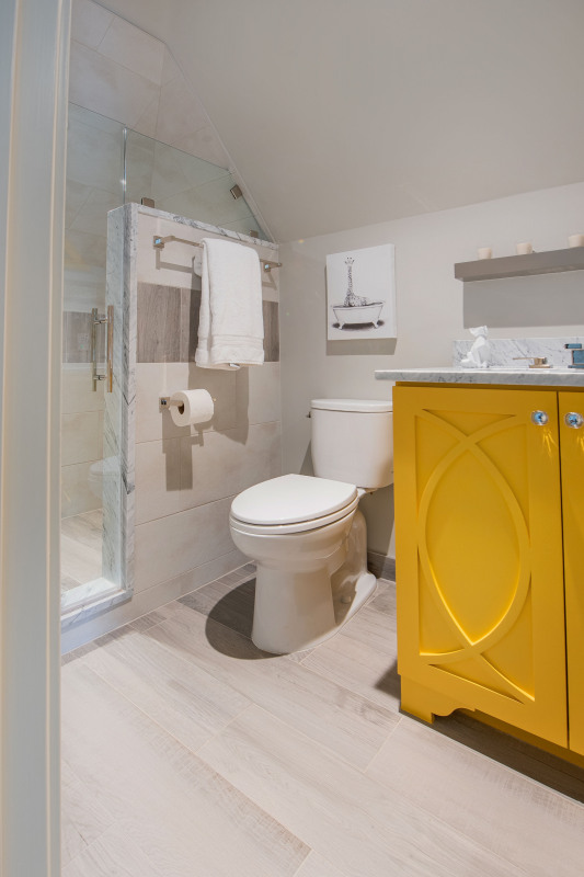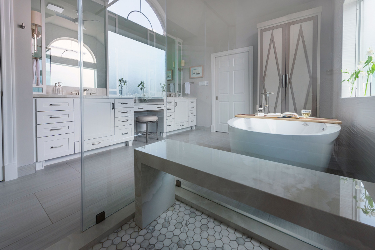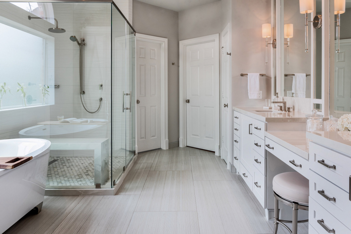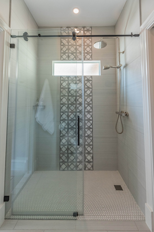 Three bathrooms were remodeled in a home in Greater Uptown, Houston. All three bathroom remodels were named the Texas Association of Builders Star Awards (TAB) Finalists. These happy homeowners now have a luxurious spa-like master bathroom with a freestanding soaker tub and large glass enclosed shower. Also remodeled is a shared Hollywood bath with a shower, and a third floor bathroom with shower. All modern features, unique tilework and contemporary finishes. The 3rd floor attic bathroom which was the smallest of the three baths, was a winner of a TAB 2022 Star Award Winner in the category of Best Bathroom Renovation under $25,000. All three bathrooms were designed by Crystal Reeves, ASID, RID of CLR Design Services, Inc.