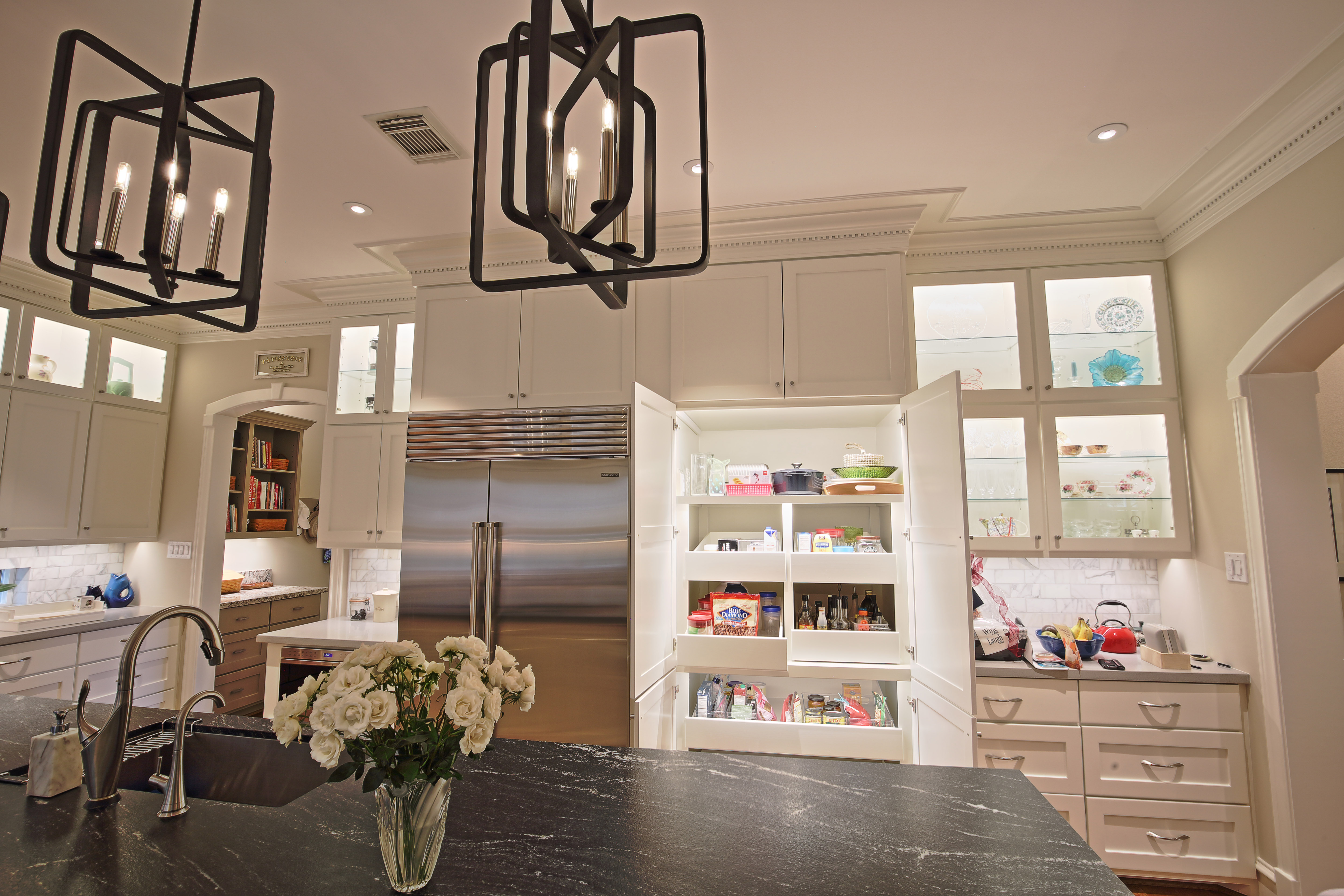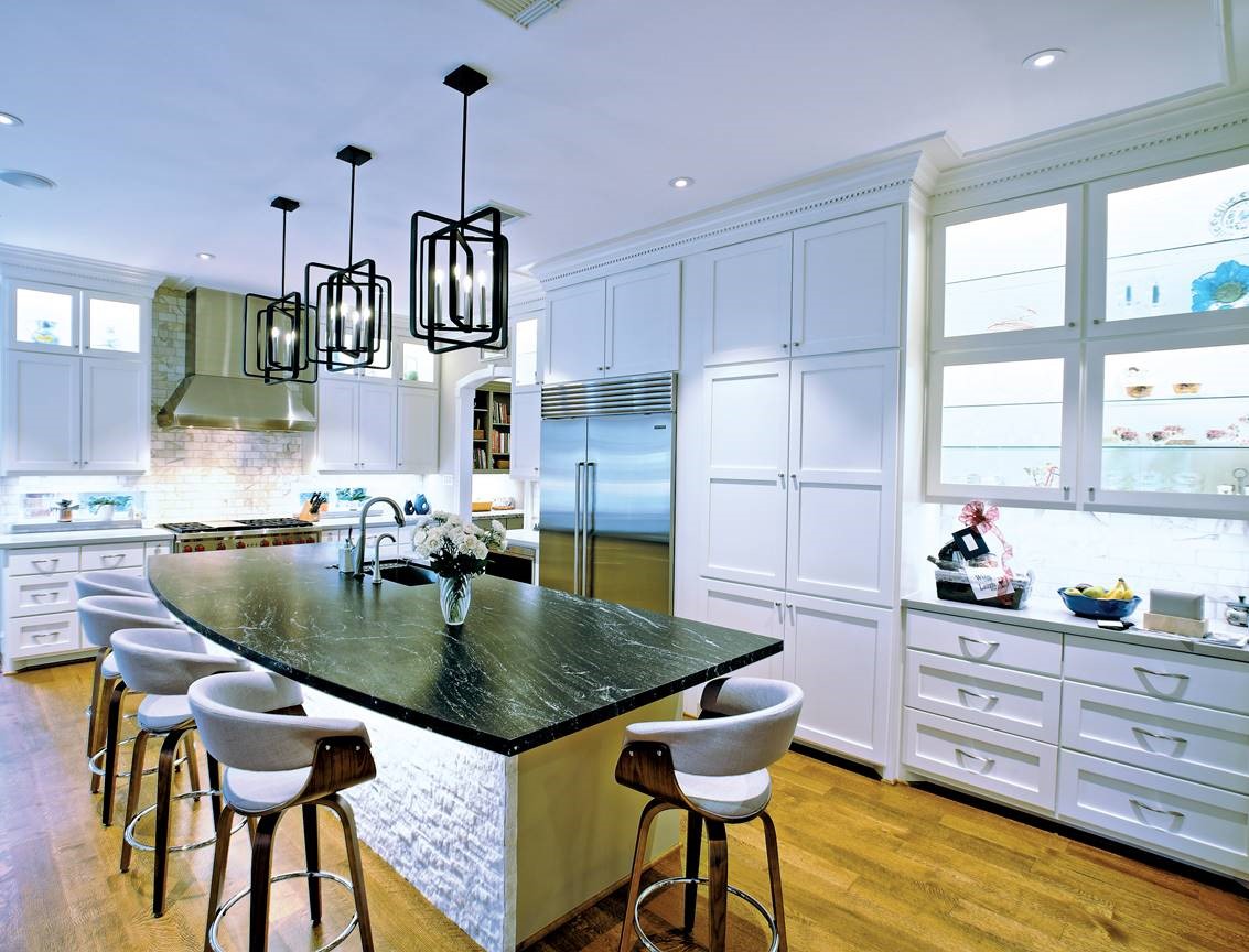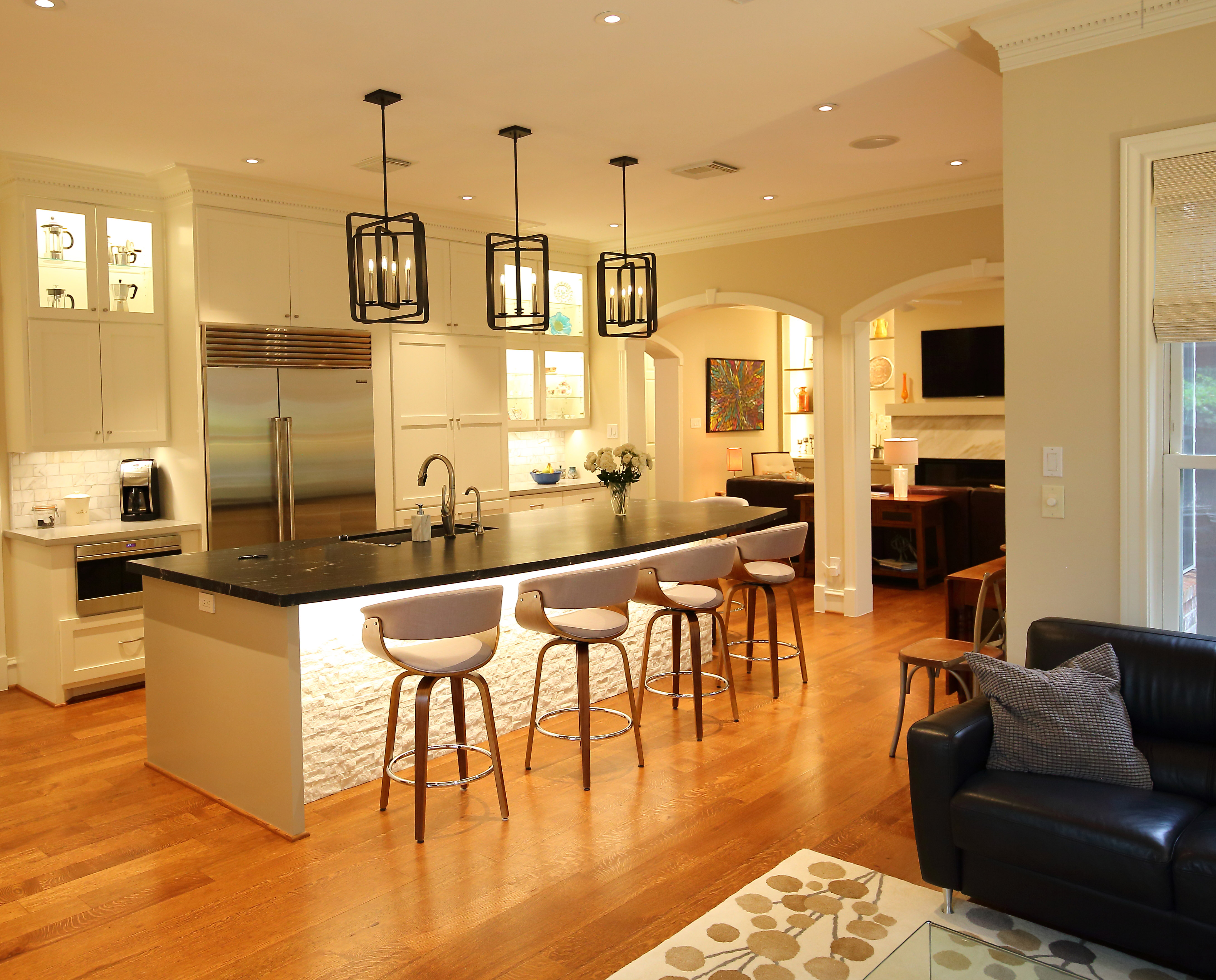 This was a full kitchen remodel in the Greater Uptown neighborhood of Houston. Originally we were hired to remodel the kitchen. However, Hurricane Harvey caused flood damage to the home and necessitated the replacement of the kitchen floor therefore new white oak hardwood was installed. The owners are avid cooks and wine enthusiasts so we gave them a kitchen space with adjoining wine room that reflected their interests. There is plenty of storage, many cabinets, some of which are floor to ceiling as well as multiple upper glass door cabinets with LED lights and glass shelves for display items. There is a custom pantry with motion activated LED lighting. A large island with lots of seating features a granite countertop, a split stone face and under counter LED lighting. The new kitchen provides form, function and brings in design features such as different textures, contrasting colors and other unique elements. Thanks to Designer Januari Works and Photographer Harry Durham for their assistance on this project. Click on photos for full photo view.