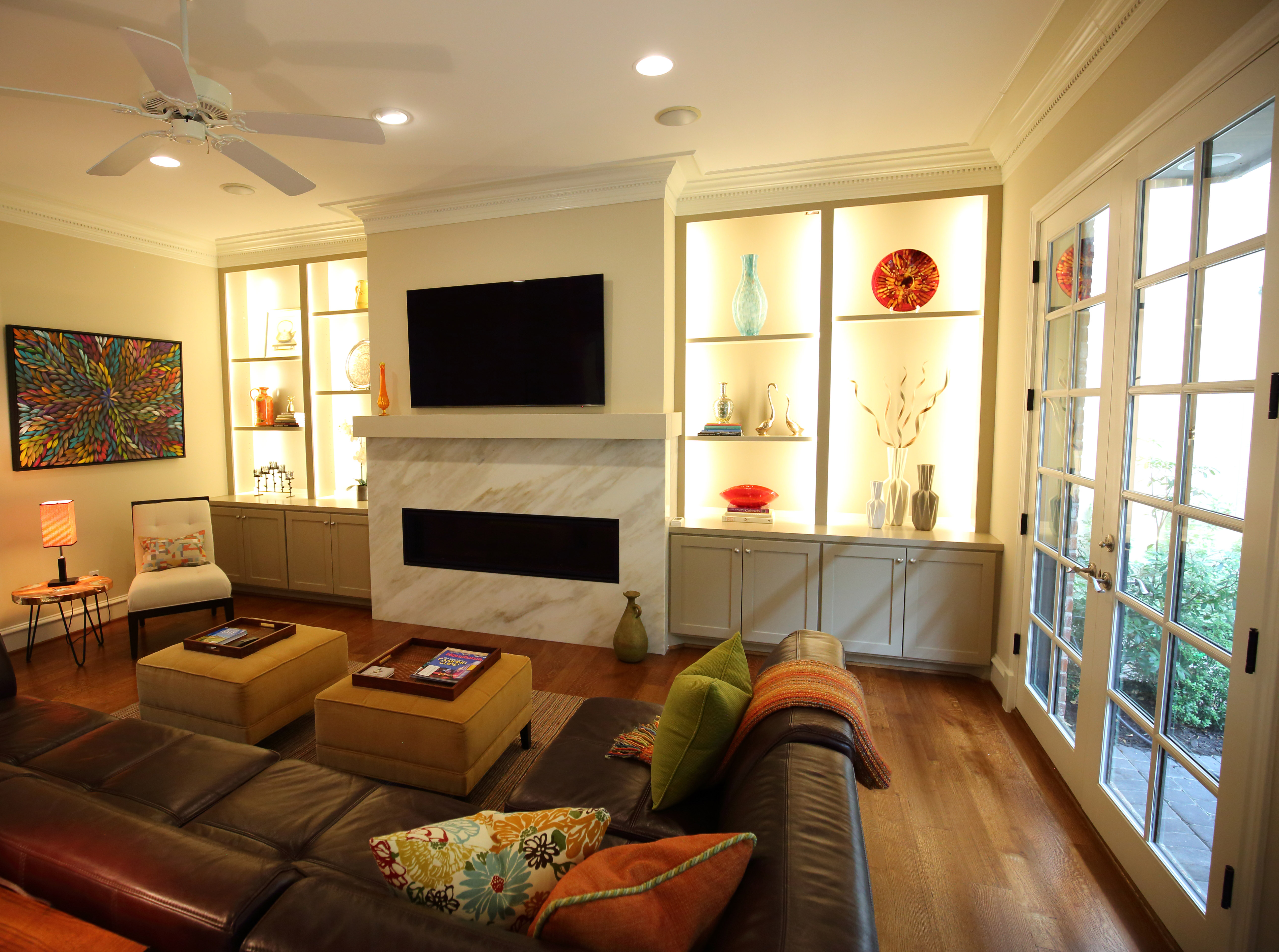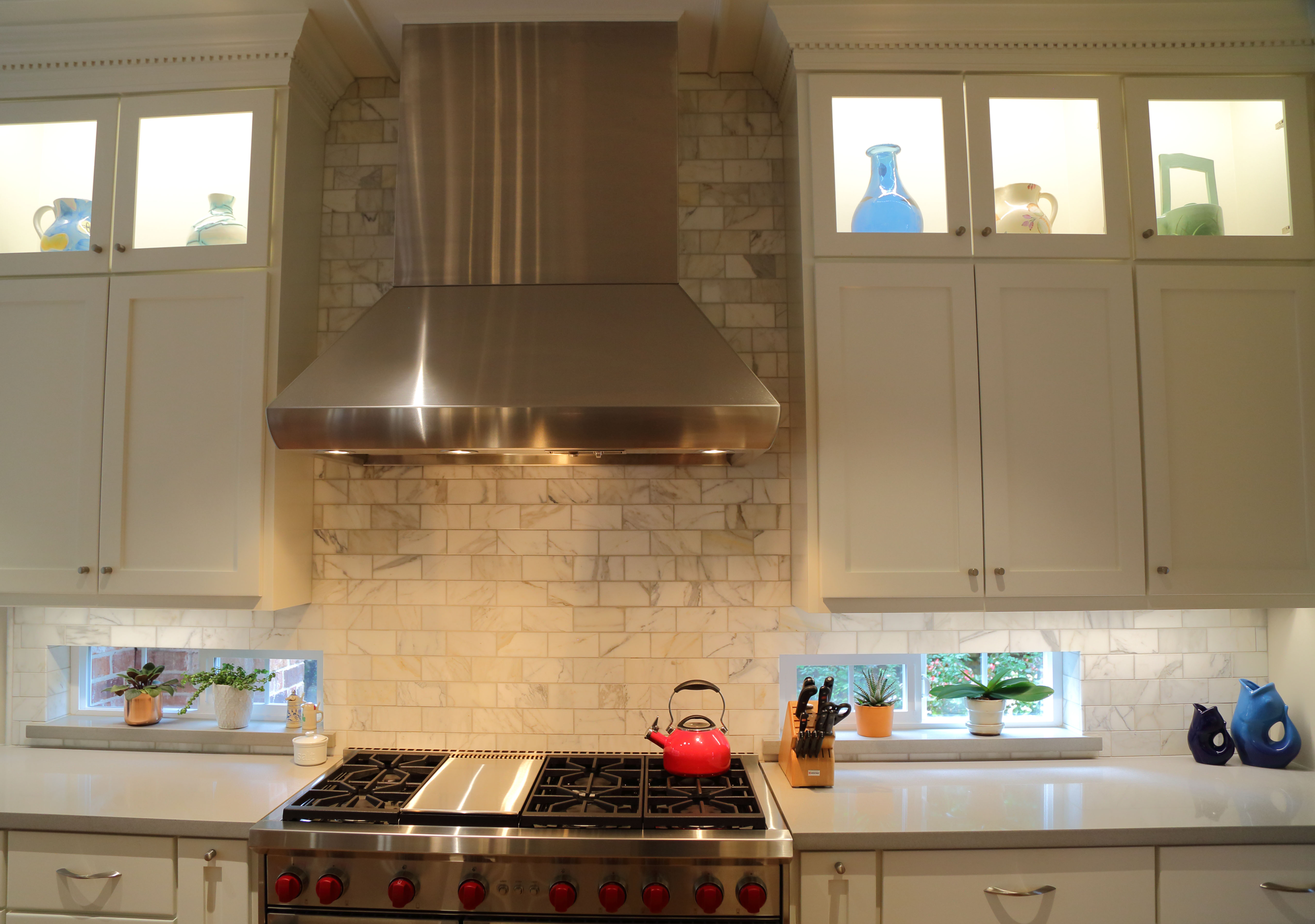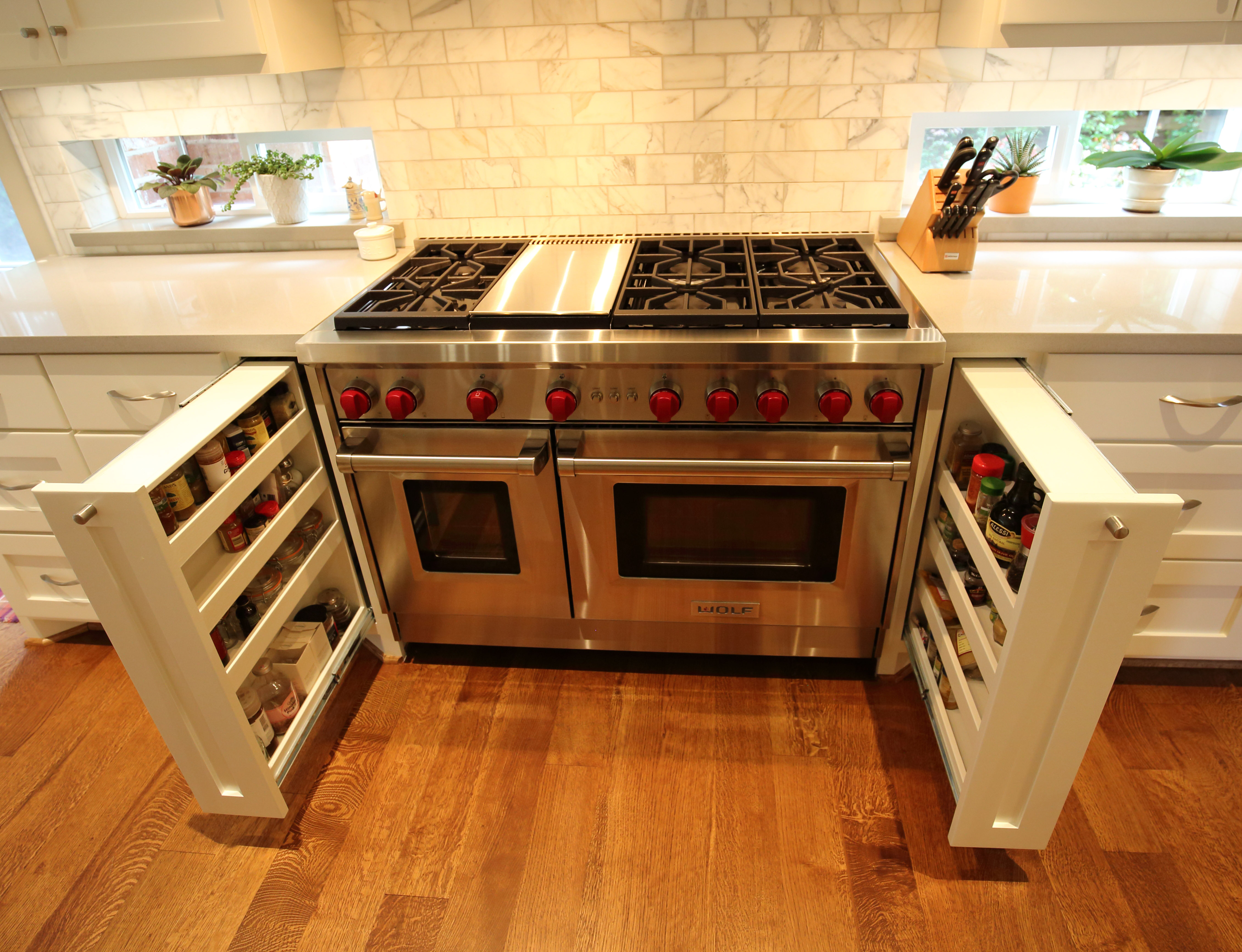 This was a full kitchen remodel in the Greater Uptown neighborhood of Houston. Originally we were hired to remodel the kitchen. However, Hurricane Harvey caused flood damage to the home and necessitated the replacement of the kitchen floor therefore new white oak hardwood was installed. The owners are avid cooks and wine enthusiasts so we gave them a kitchen space with adjoining wine room that reflected their interests. There is plenty of storage, many cabinets, some of which are floor to ceiling as well as multiple upper glass door cabinets with LED lights and glass shelves for display items. There is a custom pantry with motion activated LED lighting. A large island with lots of seating features a granite countertop, a split stone face and under counter LED lighting. The new kitchen provides form, function and brings in design features such as different textures, contrasting colors and other unique elements. Thanks to Designer Januari Works and Photographer Harry Durham for their assistance on this project. Click on photos for full photo view.