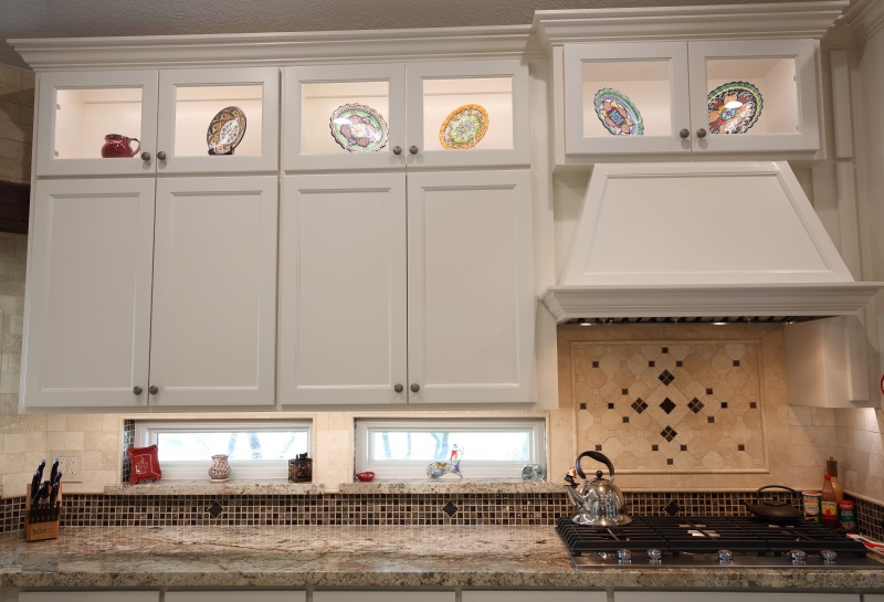 - Lighted upper display cabinets with glass doors
